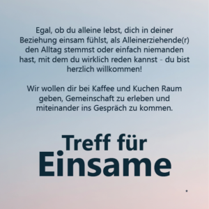 Ob du allein wohnst oder dich in der Partnerschaft einsam fühlst, komme gerne vorbei. Bei Kaffee und Kuchen wollen wir Gemeinschaft haben und uns austauschen.